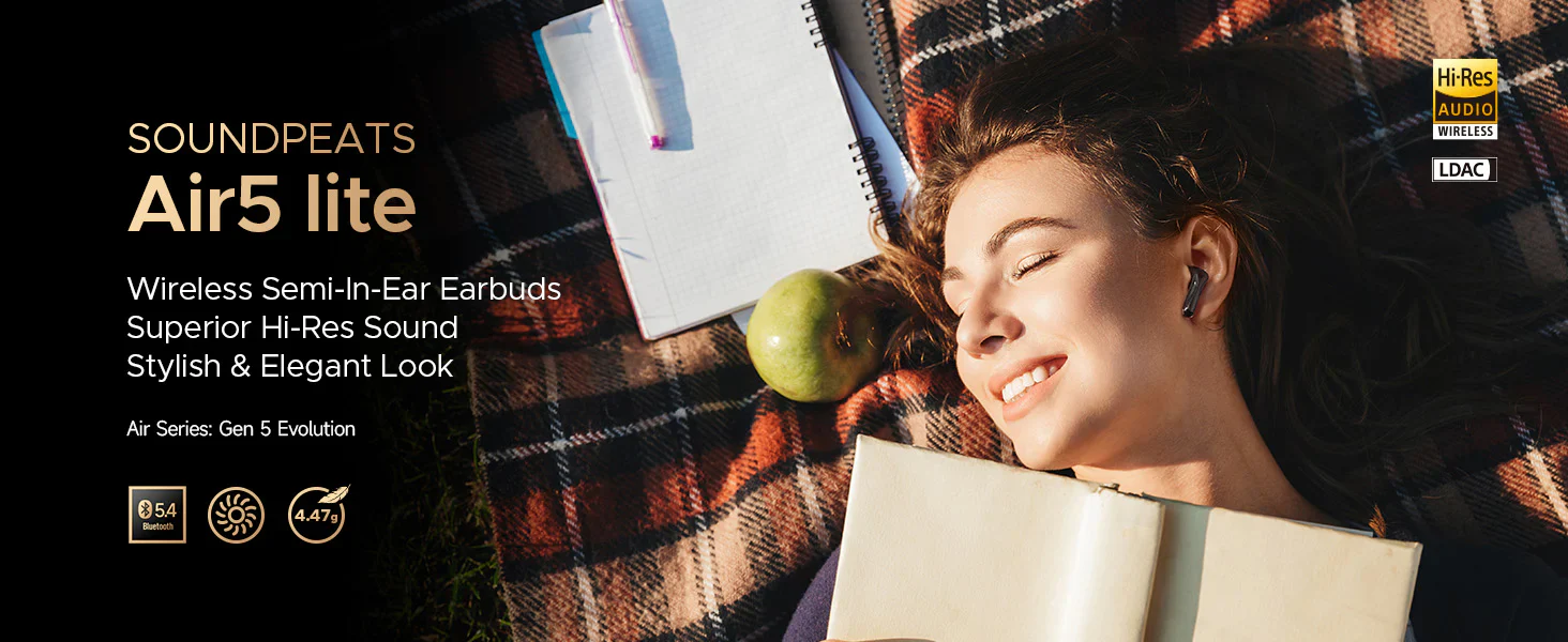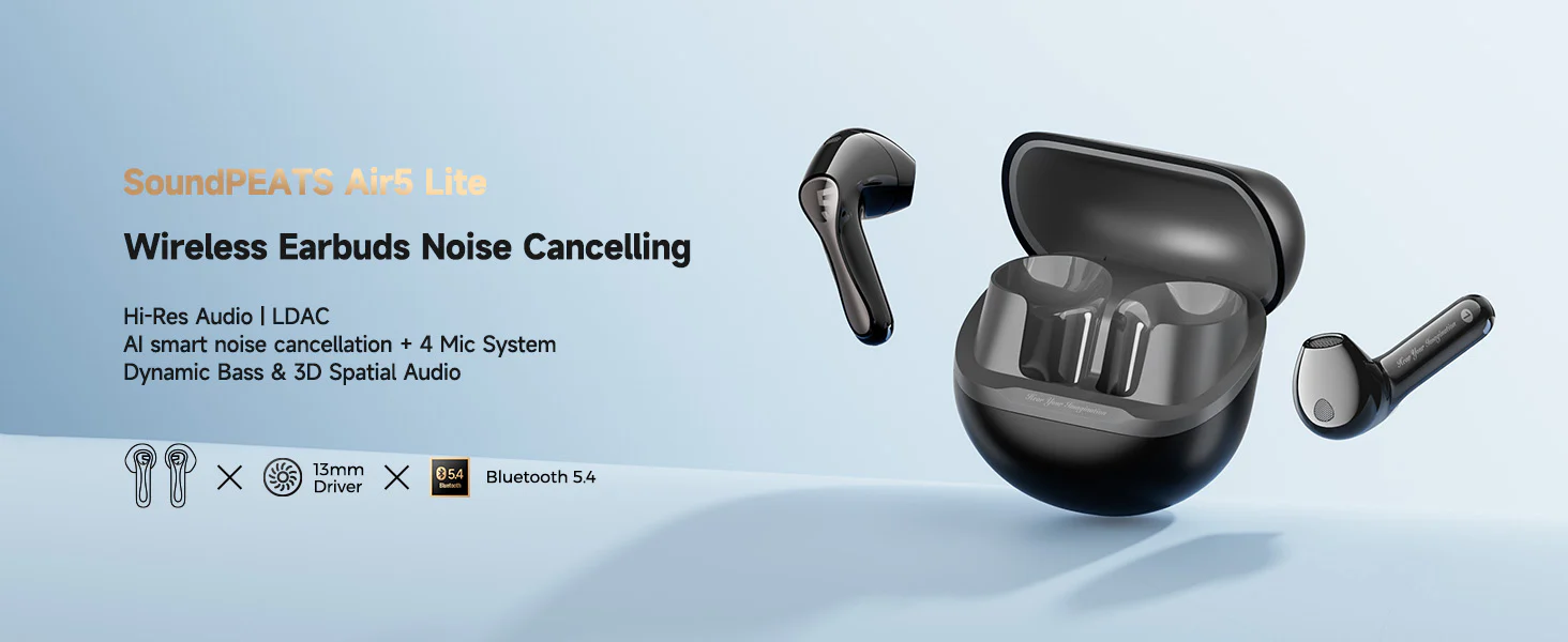 Écouteurs intra-auriculaires sans fil SoundPEATS Air5 Lite avec son haute résolution, Bluetooth 5.4, transducteurs 13 mm, codec LDAC, réduction de bruit ENC pour les appels, son stéréo, charge rapide 30 h