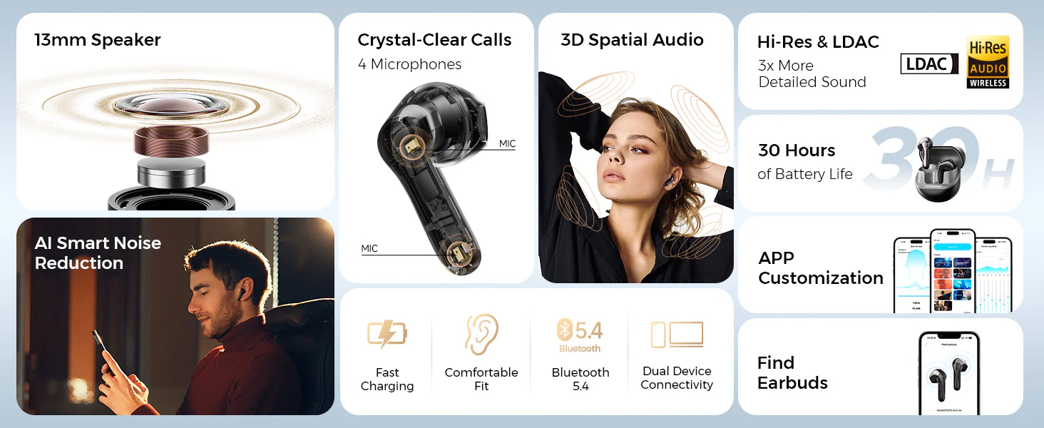 · Bluetooth 5.4 & codec LDAC : Technologie Bluetooth avancée pour une connexion ultra-rapide et stable. Le codec LDAC permet de transmettre un son haute qualité sans perte pour une expérience audio optimale.