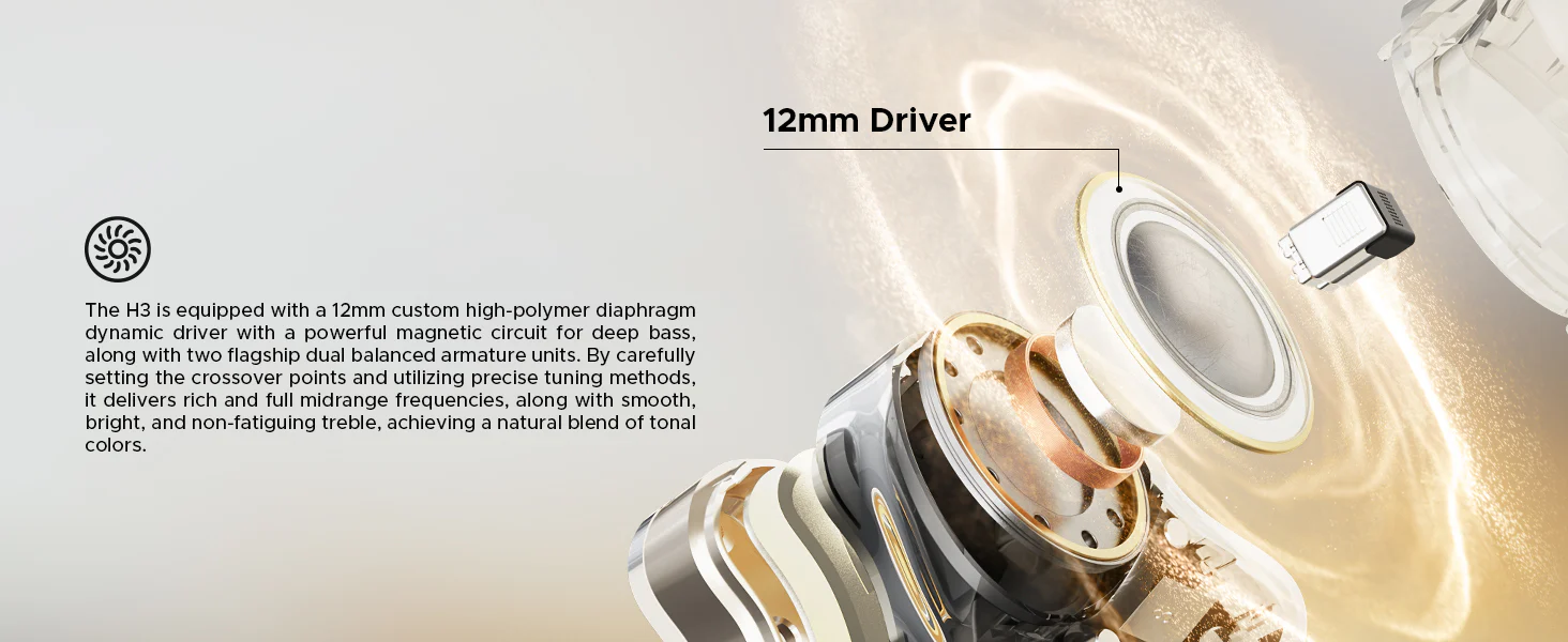 Son haute résolution : Triple driver (1 dynamique 12 mm + 2 armatures équilibrées) pour des basses profondes, des médiums clairs et des aigus précis.