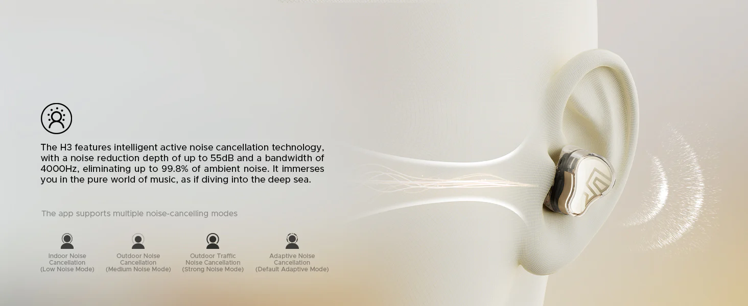Réduction de bruit hybride IA : Jusqu’à 55 dB de réduction active du bruit grâce à 6 microphones et 4 modes (Adaptatif, Intérieur, Extérieur, Trafic).