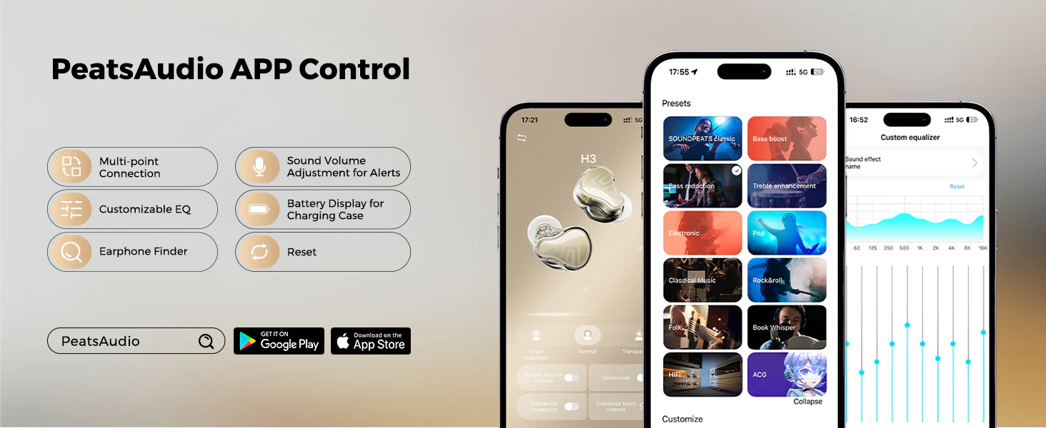 Personnalisation audio : Application PeatsAudio avec égaliseur 9 bandes pour ajuster le son selon vos préférences.